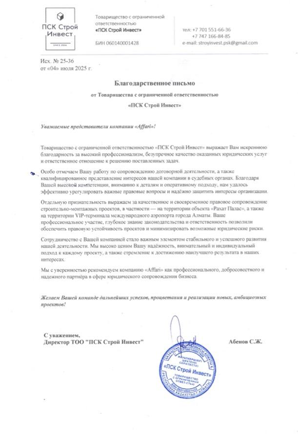 Юристы компании «Affari» превосходно разбираются в нюансах законодательства РК, что позволяет нам эффективно защищать интересы своих клиентов. Наши основные преимущества это: широкий перечень оказываемых услуг, скорое решение поставленных задач и стремление свести к минимуму финансовые издержки заказчика.